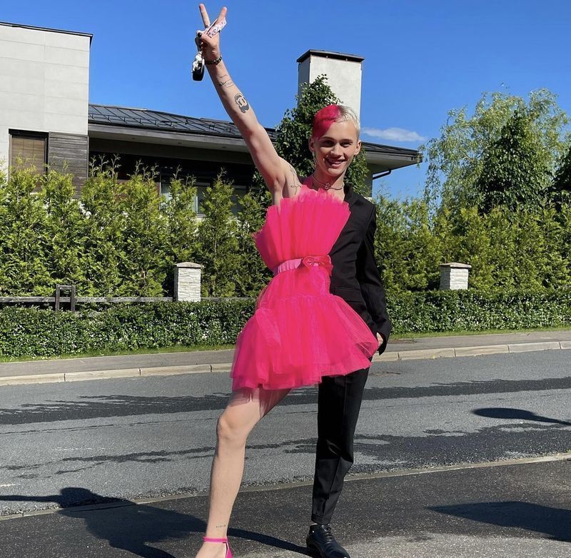 Кроме того, на церемонии выделялись своими нарядами тик-токер Даня Михолин (полукостюм-полуплатье).