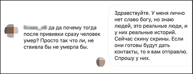 Т., которая тоже писала об умерших в комментариях, сказала, что «лично была знакома» с несколькими скончавшимися после прививки людьми, а некоторые из них — «родственники знакомых» (распространенный случай). Она пообещала уточнить у знакомых, готовы ли они разговаривать (судя по всему, не готовы). В конце переписки со словами «здесь самая актуальная инфа», она скинула ссылку на аккаунт «Иммунный ответ», авторы которого последовательно выступают против вакцинации. У канала 146 тыс. подписчиков.