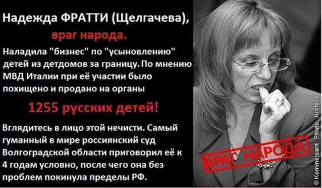 Но почему же Фемида осталась так холодна к “подвигам” этой мошенницы с двумя паспортами – российским и итальянским? Надо незамедлительно реанимировать дело Фратти. И обращаться за помощью, по всей видимости, нужно в следственные органы Италии. И искать всех вывезенных детей. Неужели нам всё равно, что стало с 1255 маленькими гражданами России? Пусть Щелгачёва ответит за каждого ребёнка. И ответит на детекторе лжи. Итальянские следователи раскалывают криминальных монстров из коза ностры, неужели не выведут на чистую воду хозяйку криминальной “Радуги”?» – заключает Надежда Попова.