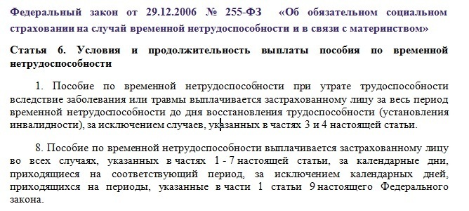 А посему применению подлежит часть 8 статьи 6 ФЗ № 255-ФЗ, согласно которой выплата пособия работнику производится за календарные дни на всё время болезни.