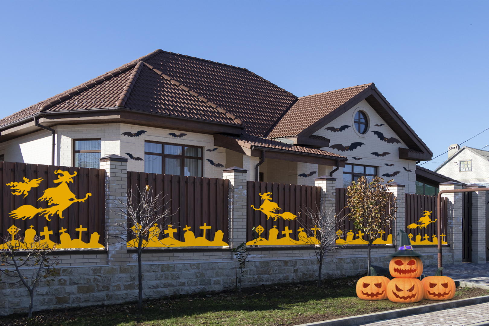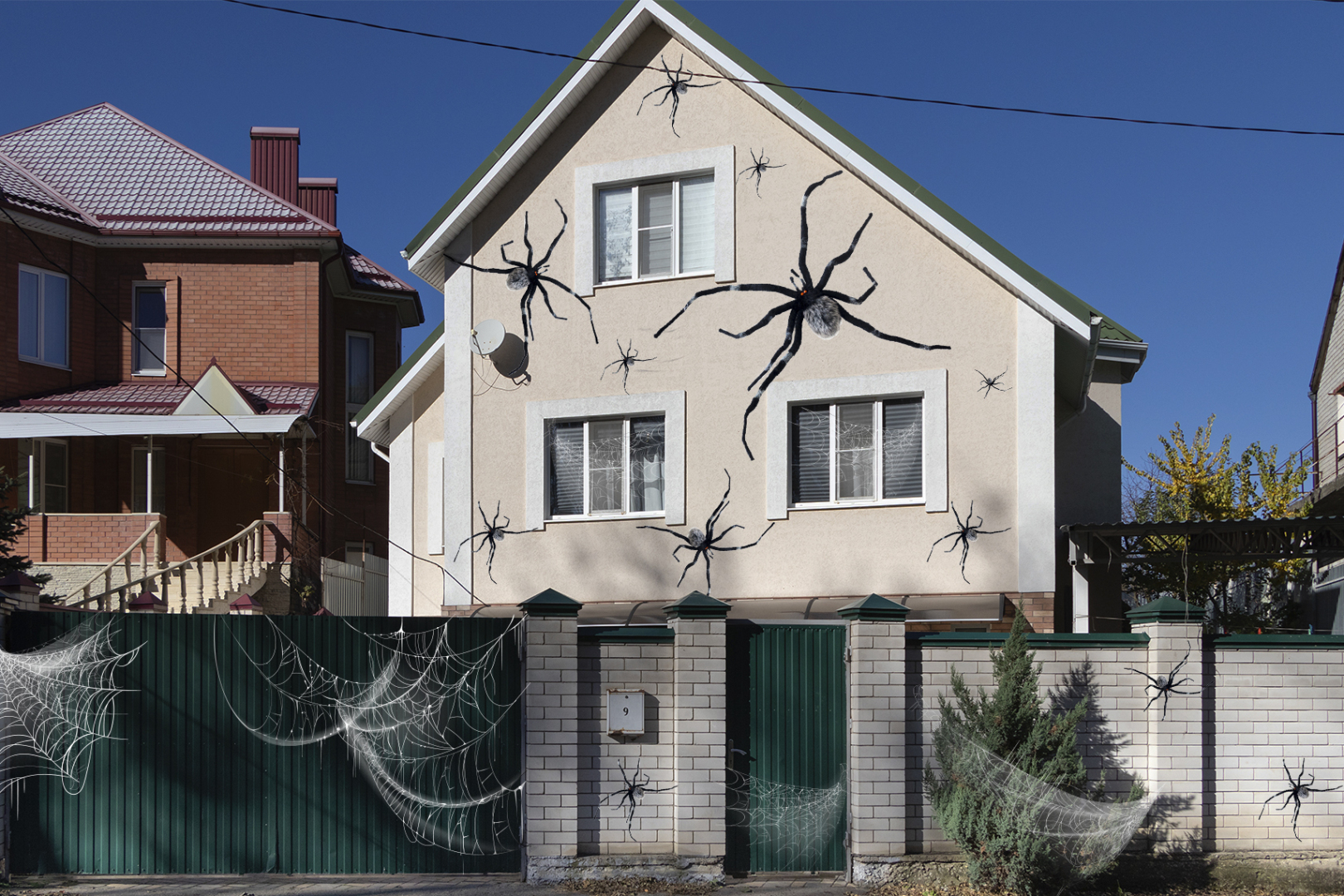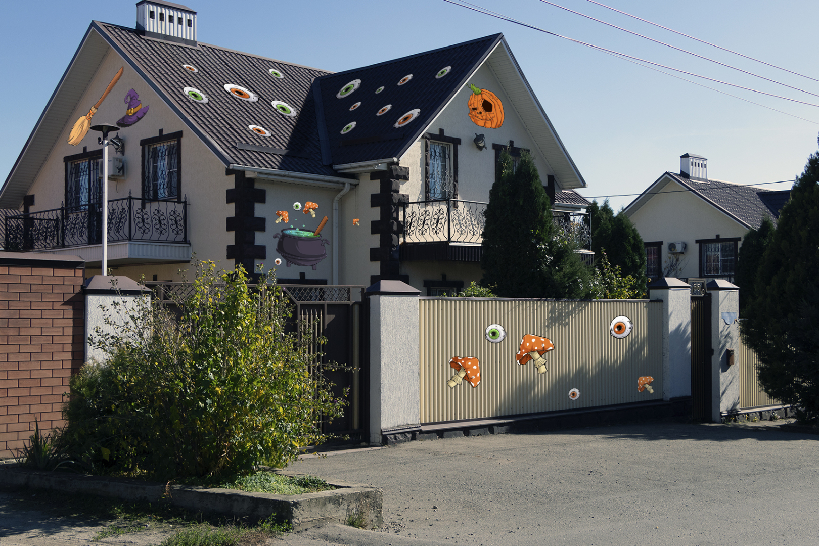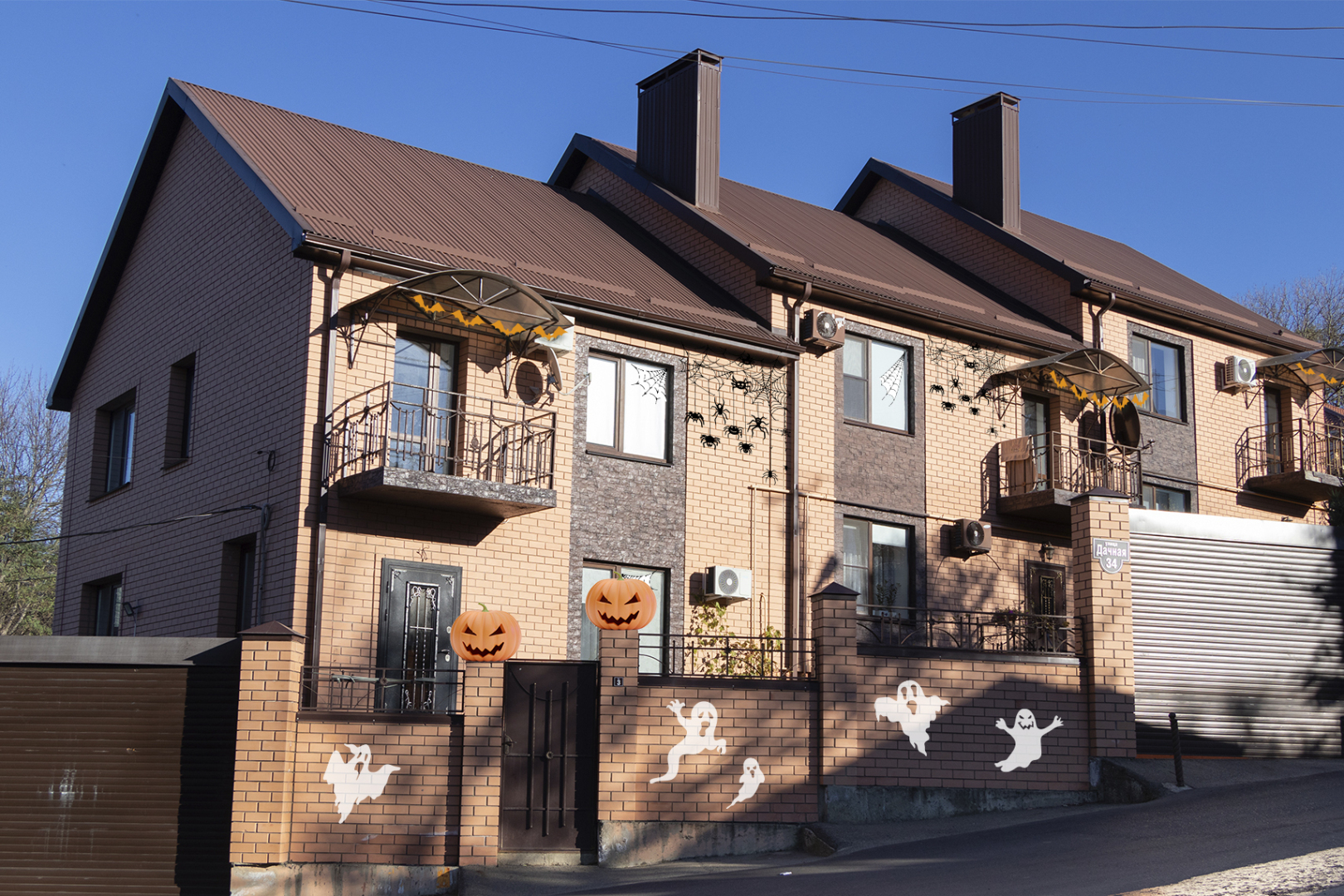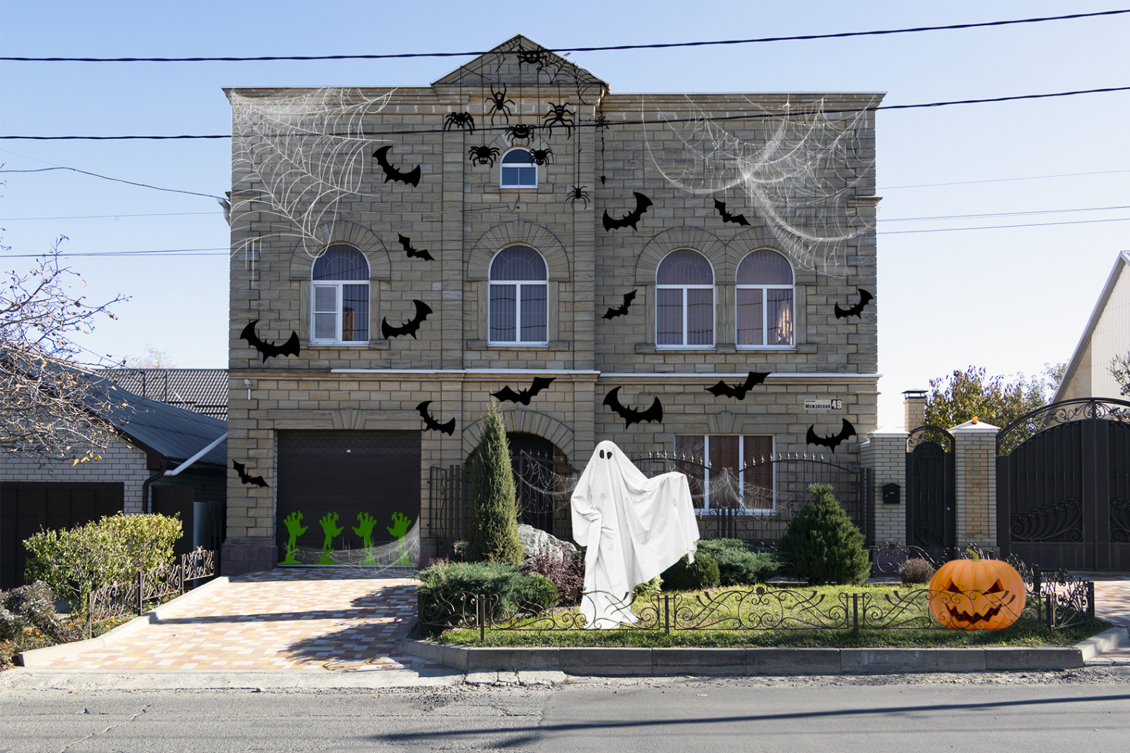 В Хэллоуин один из популярных вариантов украшения дома — «поселить» в гараже несколько зомби, которые будут пугать прохожих торчащими из-под двери руками. По соседству с ними легко разместится призрак, следящий за передвижениями через пустые глазницы. Также на стены и окна вешают пауков, плетущих лабиринты паутины и готовых поймать в них любого зеваку.
