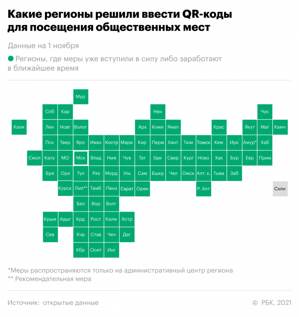 К 1 ноября остался один регион, который не ввел QR-коды – это Сахалинская область. В связи с тем, что эпидемиологическая обстановка относительно стабильна. В некоторых регионах данное решение начнет действовать чуть позже. В пример можно взять Томскую область, они в силу вступят 8 ноября.
