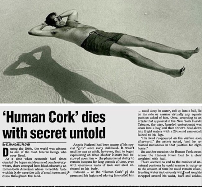 Человек-поплавок. Анджело Фатикони, родившийся в 1859 году, не тонул в воде. Он открыл свою «сверхспособность» в раннем детстве, и стал участником многочисленных экспериментов. Ученые привязывали к телу Анджело тяжелые предметы, но он упорно отказывался тонуть. Однажды он пересек реку Гудзон будучи привязанным к стулу, и держа при этом тяжелый груз. Анджело Фатикони пообещал раскрыть свою тайну в один прекрасный день, но неожиданно умер в 1931 году, забрав на тот свет секрет удивительной плавучести.