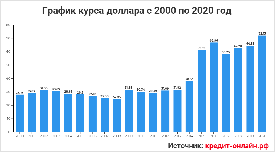 С 2000-го по 2014 год рубль был более или менее стабильным, шесть лет назад курс рубля «рухнул» сразу на 72%. Были периоды, когда рубль опускался до курса 80 рублей за доллар.