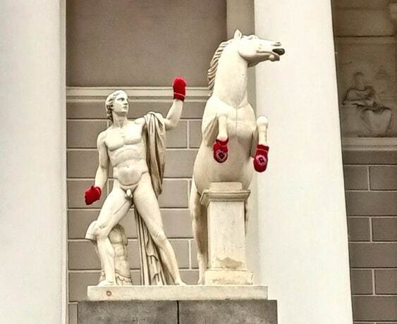 По данным СМИ, акцию провели блогеры. Они же, судя по фото очевидцев, надели красные варежки на скульптурных коней у здания Манежа на Исаакиевской площади.
