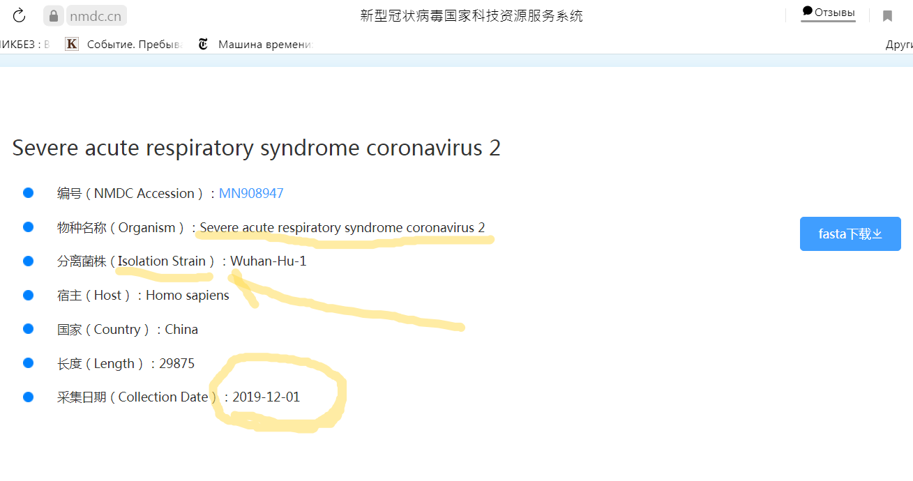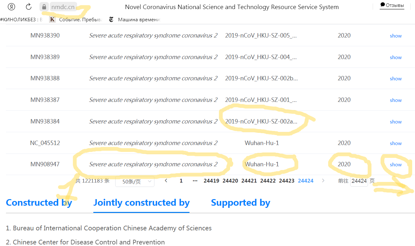 1. Информационный сайт Китайской академии наук. На сайте с первого дня выкладывались все случаи выделения вируса. Всего страниц 125291. Скрин самого первого выделения https: //nmdc.cn/nCov/en