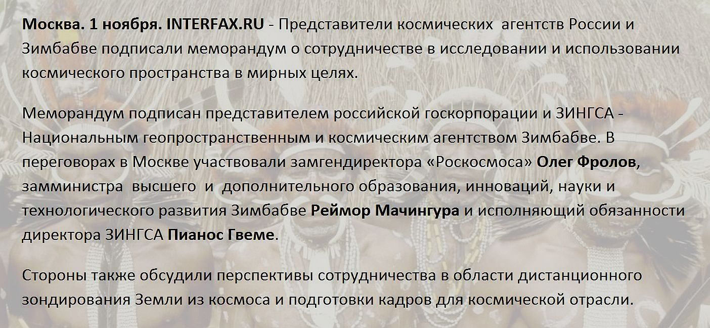 точнее, все договоры подписывались замами и ВРИО: "В переговорах 1 ноября в Москве участвовали замгендиректора "Роскосмоса" Олег Фролов, замминистра высшего и дополнительного образования, инноваций, науки и технологического развития Зимбабве Реймор Мачингура и исполняющий обязанности директора ЗИНГСА Пианос Гвеме."