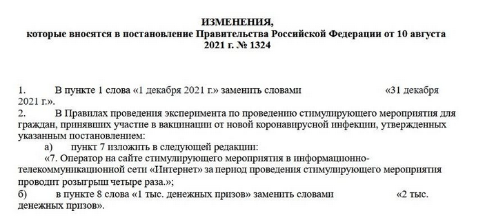 «Проектом постановления предусмотрено внесение изменений в постановление в части: продления срока проведения стимулирующего мероприятия до 31 декабря 2021 года; изменения количества проводимых за период стимулирующего мероприятия розыгрышей денежных призов с двух до четырёх раз; изменения количества денежных призов с одной тысячи до двух тысяч», – заявлено в пояснительной записке к Постановлению Правительства РФ «О внесении изменений в Постановление Правительства Российской Федерации от 10 августа 2021 г. № 1324».