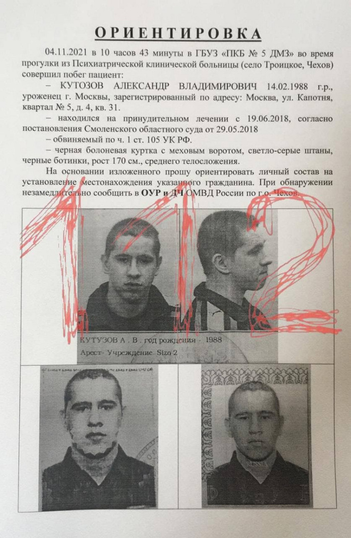 Из психбольницы в подмосковном Чехове сбежал особо опасный преступник — 33-летний Александр Кутозов. Он был осужден за убийство (ч.1 ст. 105 УК РФ) и признан невменяемым.