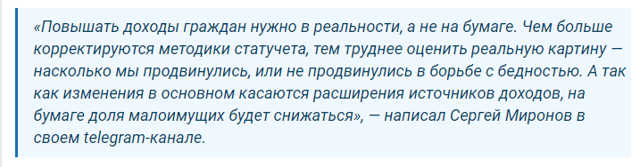Почему-то я даже не сомневаюсь в ее словах. Подобная корректировка в статистических отчетах, несомненно, даст возможность повысить показатели уровня благосостояния россиян. Станет и снижаться доля малоимущих граждан, что позволит чиновникам рапортовать о своих достижениях по борьбе с бедностью, а также экономить бюджет на выплате пособий.