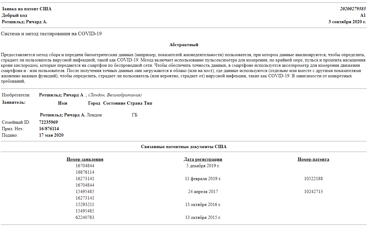 Ничего удивительного.Вакцина была уже готова,до начала пандемии.То есть прежде,чем был выпущен "джинн" в Ухане в Китае.Всё это тонко спланированная и чудовищная операция сильными мира сего и власть имущими.Ротшильд ещё в 2015 году подавал заявку на патент о тестировании ПЦР тестов Ковид 19.Потом в 2017 году.Эти заявки не были зарегистрированы по каким то причинам.И лишь в 2020 году его заявку зарегистрировали.Вопрос,откуда Ричард Ротшильд мог знать о вирусе Ковид 19 в 2015 году?