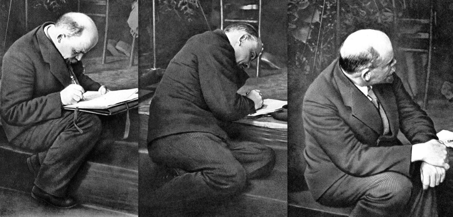 3 - В.И. Ленин на заседании III конгресса Коминтерна, сидя на ступеньках трибуны, делает записи. Москва, июнь-июль 1921 года
