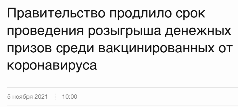 Вчера, 5 ноября, Правительство России продлило розыгрыш до конца текущего 2021 года. То есть 100 000 рублей среди вакцинированных от COVID-19 россиян разыграют еще два раза в текущем году). Напомню, что прошло уже два таких розыгрыша призов.