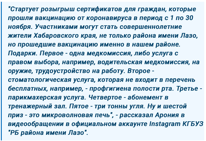 Совместно с администрацией муниципального района имени Лазо розыгрыш призов среди вакцинированных в Хабаровском крае будет проведен в прямом эфире аккаунта ****.com%2Flazo_rb%2F">Instagram**** больницы 1 декабря.