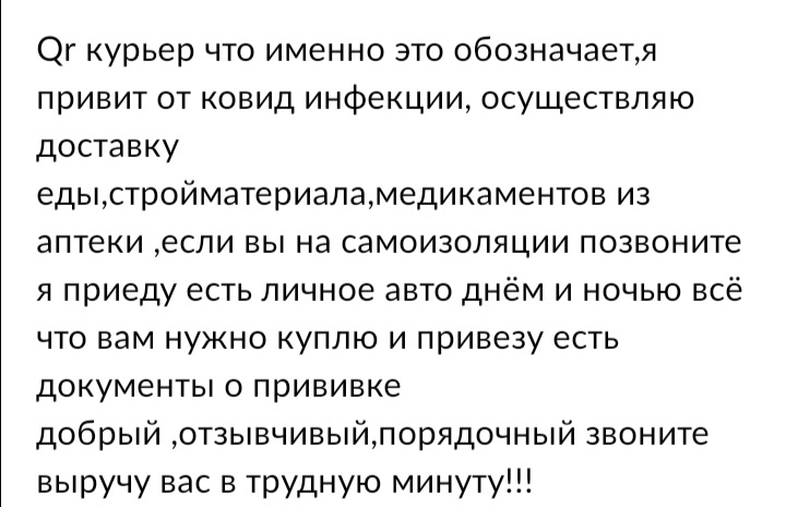 QR-курьер предлагает за денежку сделать то, с чем человек без QR-кода сам не справится: выполняет поручение в организациях, где для входа требуется предъявить QR-код.