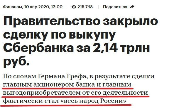 И это бы никак не повлияло ни на расходы бюджета, ни на работу Сбера: он бы продолжал свою деятельность, но при этом контрольный пакет принадлежал бы реально народу России. Реально, а не как сказал Греф.