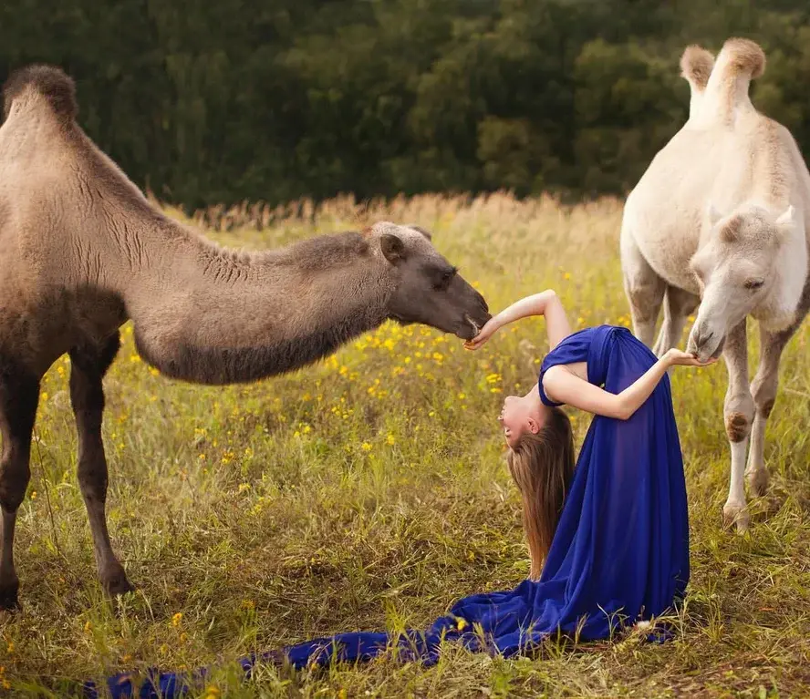 Работы Катерины Плотниковой поражают воображение не только единством людей и животных, но и окружающими их изумительно красивыми, завораживающими, можно сказать сказочными пейзажами.