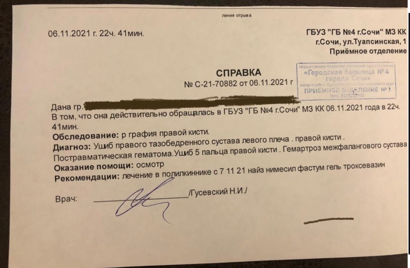 Пострадавшая 27-летняя сотрудница ресторана была вынуждена обратиться за медицинской помощью, поскольку получила многочисленные ушибы и гематомы, травмировав правое плечо, бедро, но больше всего - кисть руки.