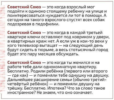 Те, кто хает сейчас СССР, имеют только потребительские критерии жизни. Согласна, что было много формализма, лицемерия, но по - большому счету идеология работала. Общество было намного доброжелательней до 90-х годов, когда нас разделили и стали нами управлять. Работали не на "дядю" , а на общее благо, не было чувства, что тебя эксплуатирует работодатель и ему законы не писаны. В основном уровень жизни у всех был одинаков, не было такого социального неравенства, как сейчас. Живем сытно и хорошо , но далеко не все. Бедность скрывают как могут, живут в кредит, потому , что бедность презирается, рабочего человека не уважают. Деньги правят всем и всеми, это хорошо или плохо?