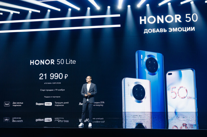 В продаже Honor 50 появится с 19 ноября 2021 г. Первые покупатели также получат приятные бонусы от партнеров бренда: два месяца бесплатной подписки от ivi, 30 дней подписки «Яндекс плюс» и скидку 25% на покупку в «Литрес».