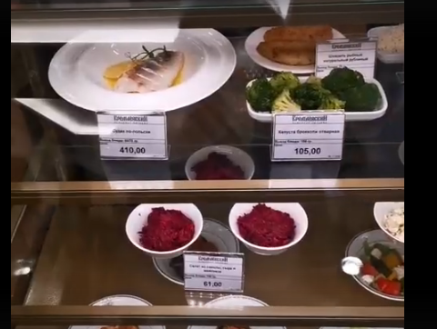 На кадрах ролика видно, что пара сосисок стоит 72 рубля, блинчики с мясом - 105 рублей, запеканка из творога 121 рубль, сырник подешевле - 88 рублей, семга отборного соления продается по 295 рублей, а вот за «судака по-польски» депутату придется выложить 410 рублей.