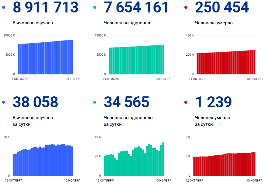 Оперативные данные по заболеваемости коронавирусом в России опубликованы 10 ноября. Информирует о статистике заболеваемости оперштаб по борьбе с COVID-19.