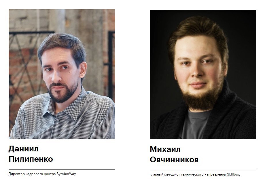Вы будете учиться у директора центра по подбору IT-специалистов SymbioWay Даниила Пилипенко и главного методиста технического направления Skillbox Михаила Овчинникова.