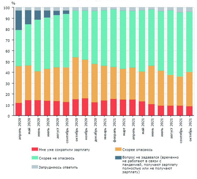 В октябре индикатор, отражающий опасения относительно потери работы, вернулся на уровень июня-июля 2021 года, «когда люди тревожились из-за третьей волны пандемии», но он все еще остается ниже уровней осени прошлого года, отражавших волнения работников на фоне второй пандемической волны. Доля опасающихся уменьшения заработной платы пока тоже далека от значений прошлой осени, «но приближается к уровням, зафиксированным на фоне третьей волны», сообщается в материалах ФОМ.