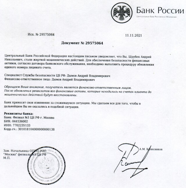 Они очень долго и грамотно разводят - меня чуть не убедили... Говорили грамотно, без акцента, там было и о конфиденциальности, и о помощи органам, и об уголовной ответственности, и о том, что с моих счетов вот-вот снимут деньги... прислали “официальный” документ… в общем, психологически очень грамотно выстроено всё было... И ведь знают, что я пенсионер, гады, и что у меня 7 тысяч на счету до пенсии осталось... их интересовала кредитка. Чтобы я сам снял с неё деньги и перевёл на продиктованные ими счета... Вот тут я окончательно понял, что это развод... Главное, у них была непрерываемая линия... оставайтесь на связи, а они тебя ведут до банка... Всё очень круто спланировано... Звонили с Московских номеров...