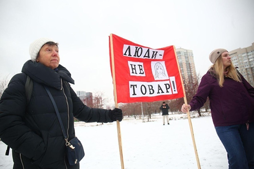 Яромир Романов / Znak.com На акции было несколько плакатов, отсылающих к нацизму и концлагерям. Один участник надел на себя желтую звезду — лату, которую евреи должны были носить на подконтрольной властям Германии территории во время Холокоста. Две девушки держали плакат с фотографиями заключенных из концларегей, на которых были номера.