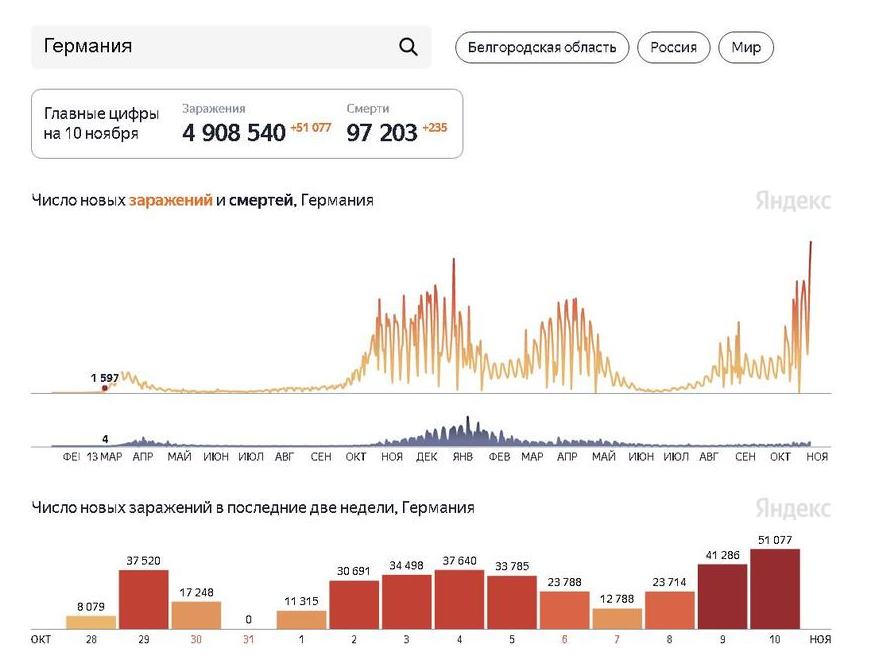 Притом, единственным обоснованием всего этого ковидобесия телеэкспертов являются данные работающих на фармкомпании ученых и "мировой опыт". Тот самый "вот в Европе". Самое интересное, что в этой самой Европе, где уровень вакцинации выше в два и более раз, сейчас происходит ровно то же самое, что и в России. Почти синхронно с нами уже неизвестно какая по счету волна накрыла Германию, где обновили рекорд по заболеваемости и которая стала мировым лидером по данному показателю - 51 077 новых случаев заболевания коронавирусом.