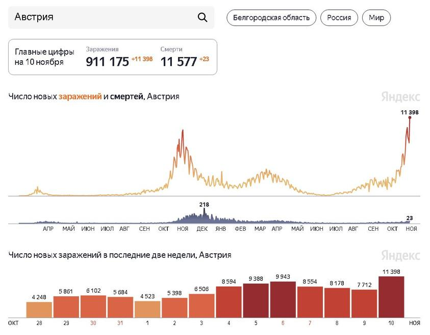 И даже это еще не все, такая же точно ситуация и в Австрии. Буквально один в один. Там тоже рекорд по заболеваемости. Вчера была выявлено 11 тыс. 389 случаев при 76% привитых одним компонентом и 70% привитых полностью от всего населения.