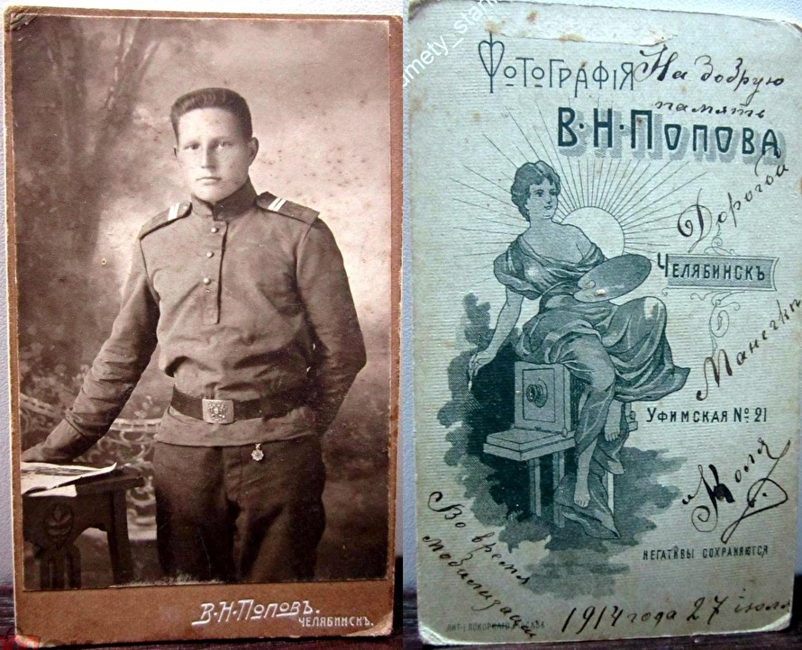 Фотография Попова. 1914 год Из открытых источников Челябинские фотографы могли приобрести необходимые материалы, принадлежности и оборудование, по крайней мере, в трех городских магазинах (Бумагина, Гуревича и Иванова), а при необходимости выписать недостающее из российских столиц или из-за границы.
