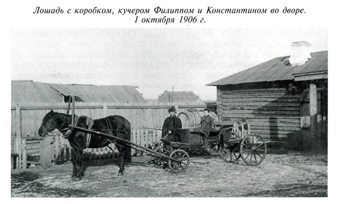 «С 1 октября [1906 года] обзавелся фотографическим аппаратом. Подумывал давно, — теперь подвернулся удобный случай. Помощник акцизного надзирателя Михаил Александрович Протасов в прошлом году прожил месяц в Германии — в г. Йене, где его жена Виктория Робертовна лечила уши у какой-то немецкой знаменитости… В Йене же находилась известная всему миру фабрика объективов Карла Цейса, на фабрике выделывали и фотографические аппараты полностью. Протасов купил аппарат 13×18 со всеми принадлежностями, сделал несколько снимков, фотография ему не понравилась, — сложил все в футляр и… успокоился. В. И. Филиппов, обладая большим маклерским талантом, посоветовал Протасову продать, а мне купить этот фотоаппарат, и Протасов уступил мне его по своей цене — около 250 р. Я был доволен, — аппарат прекрасный. Квадратная камера с двойным растяжением, объектив — сильный анастигмат — уже, несомненно, подлинный Цейса — с ирисовой диафрагмой; три двойных кассеты, треножник — все очень хорошей работы… Сделали сообща с В. И. Филипповым снимки во дворе, сообща проявили, — вышло хорошо. Он составил длинный список реактивов, бумаги, принадлежностей для печатания и дальнейшей обработки, каких у Протасова не было. Я кое-что выбросил, — послал заказ Иохиму в Москву…»