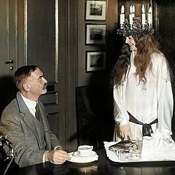 Обладатель Нобелевской премии (1930) Карл Ландштейнер в обществе шведской королевы света Люции, которую в Швеции выбирают дети в Праздник Святой Люции (13 декабря) накануне Рождества.«Берлинер моргенпост», 16.12.1930
