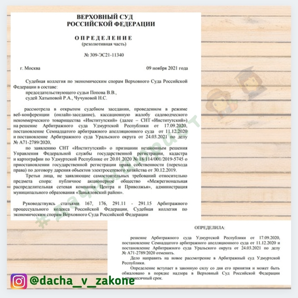9 ноября 2021 г. ВС РФ отменил все решения нижестоящих судов, которые СНТ отказывали, и вернул дело на новое рассмотрение в суд 1 инстанции.