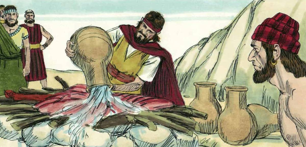 "Тогда Илья сказал народу: «Подойдите ко мне», и все подошли к нему. Илья восстановил разрушенный жертвенник Иеговы. Он взял 12 камней — по числу племён сыновей Иакова, которому Иегова сказал: «Твоё имя будет Израиль». Из этих камней он построил жертвенник во имя Иеговы и сделал вокруг него канаву на участке, который можно засеять двумя са́тами семян. После этого он разложил дрова, разрубил молодого быка на куски, положил его на дрова и сказал: «Наполните четыре больших кувшина водой и вылейте её на жертву всесожжения и на дрова». Потом он сказал: «Повторите», и они повторили. Он снова сказал: «Сделайте то же в третий раз», и они сделали то же в третий раз. Вода полилась со всех сторон жертвенника. Также Илья наполнил водой канаву" (3 Царств 18:30 - 35, перевод "Новый мир").
