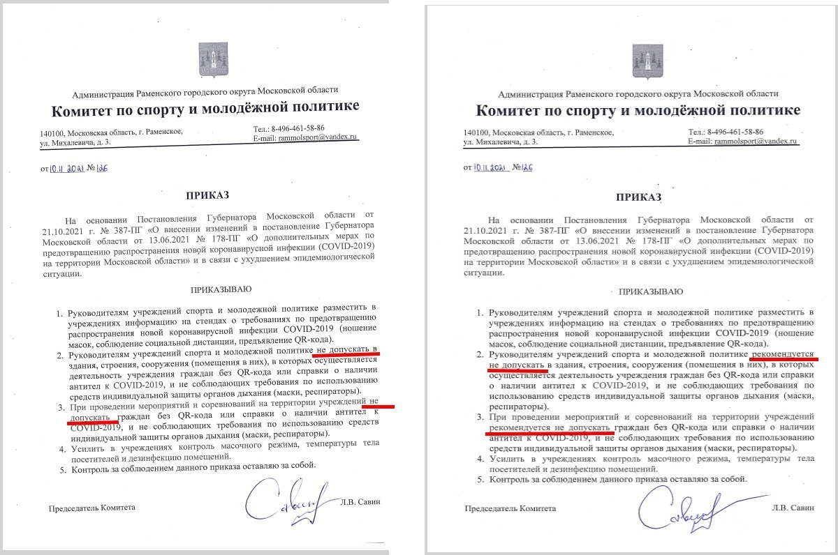 Родители стали звонить и требовать пояснить основания для этого и почитать чиновника постановление. Оказалось что он его просто не читал и бежал так сказать "впереди паровоза", решил выслужиться прихвостень. И после требований в приказе Комитета спорта и молодёжной политики его перепечатали и вместо слов не допускать, появились рекомендуется не допускать без QR-кодов.