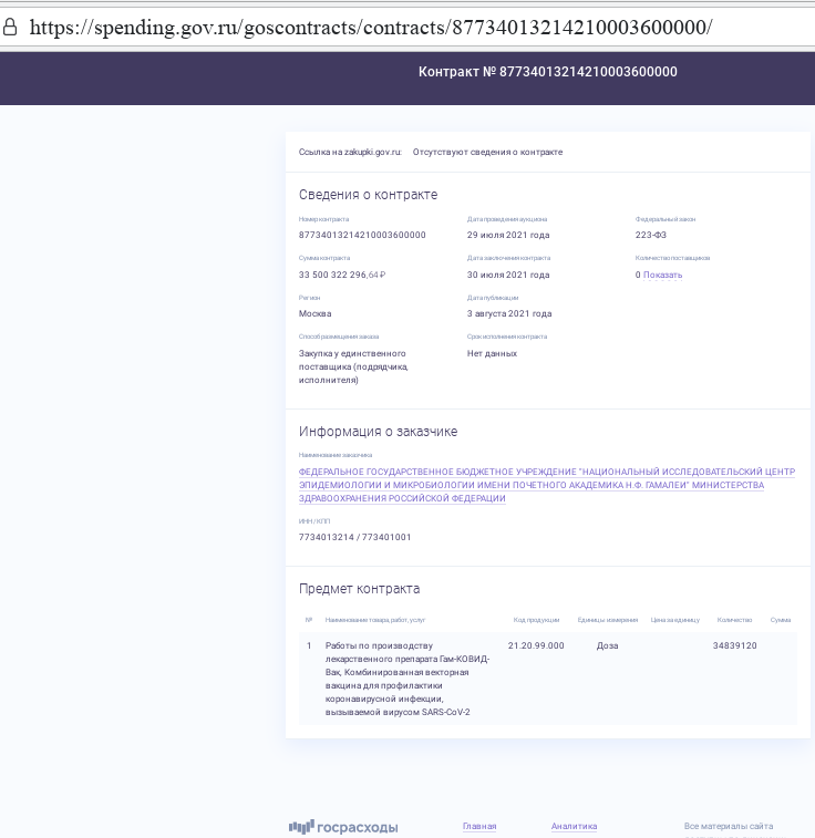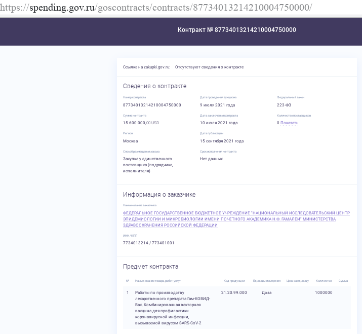 Центр, который числится производителем вакцины «Спутник V», за 2020−2021 годы выступал заказчиком (!) порядка 30 госконтрактов на «выполнение работ по производству лекарственного препарата Гам-КОВИД-Вак». Все контракты были подписаны по схеме «закупка у единственного поставщика», но сам поставщик не раскрывался.