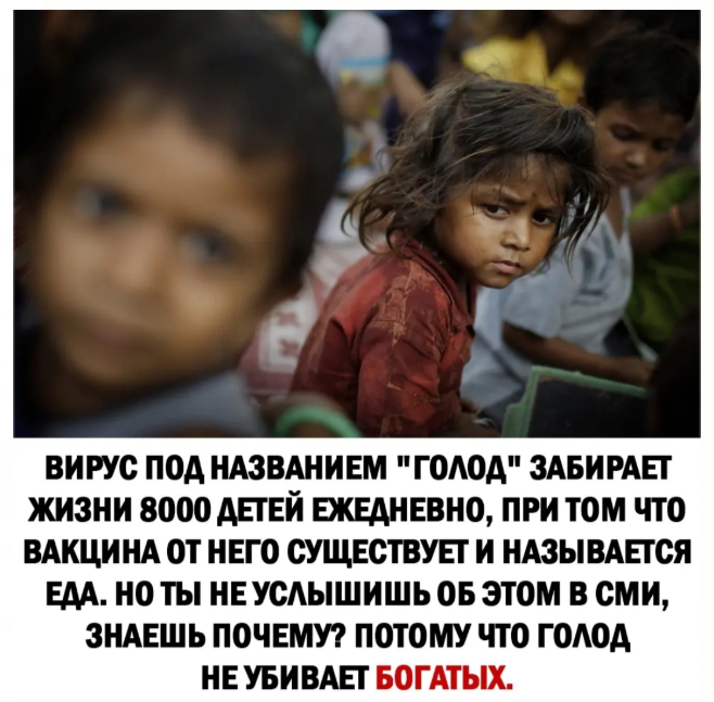 Рост смертности от голода в 5 раз превышает потери от COVID-19. Кстати, Дэвид Бизли обратился к бизнесу с предложение собрать 5 миллиардов долларов для помощи в борьбе с голодом в слаборазвитых странах. Деньги не были собраны, масштабы голода продолжали нарастать. Бизнес проигнорировал это предложение.