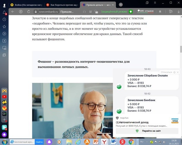 Вот уже несколько дней мне пытаются как бы перевести деньги. Непонятные деньги. Конечно, я просто закрываю эти сообщения, поскольку представляю, что если я откликнусь на эти сообщения, то могу запросто попасть на удочку, точнее широко расставленные сети мошенников. И такие сети на ловлю доверчивых граждан закинуты очень широко. Поэтому я решил написать, как лучше действовать. На собственном примере. Вот ниже скрин с моего монитора о якобы перечислении мне некоторых сумм.