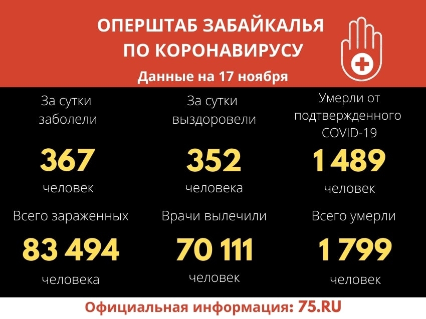 По данным на 17 ноября, за сутки в Забайкальском крае выявлено 367 новых подтверждённых случаев заболевания коронавирусной инфекцией. С начала пандемии опасный вирус обнаружен у 83 494 забайкальцев. Ситуация находится на особом контроле правительства Забайкальского края.