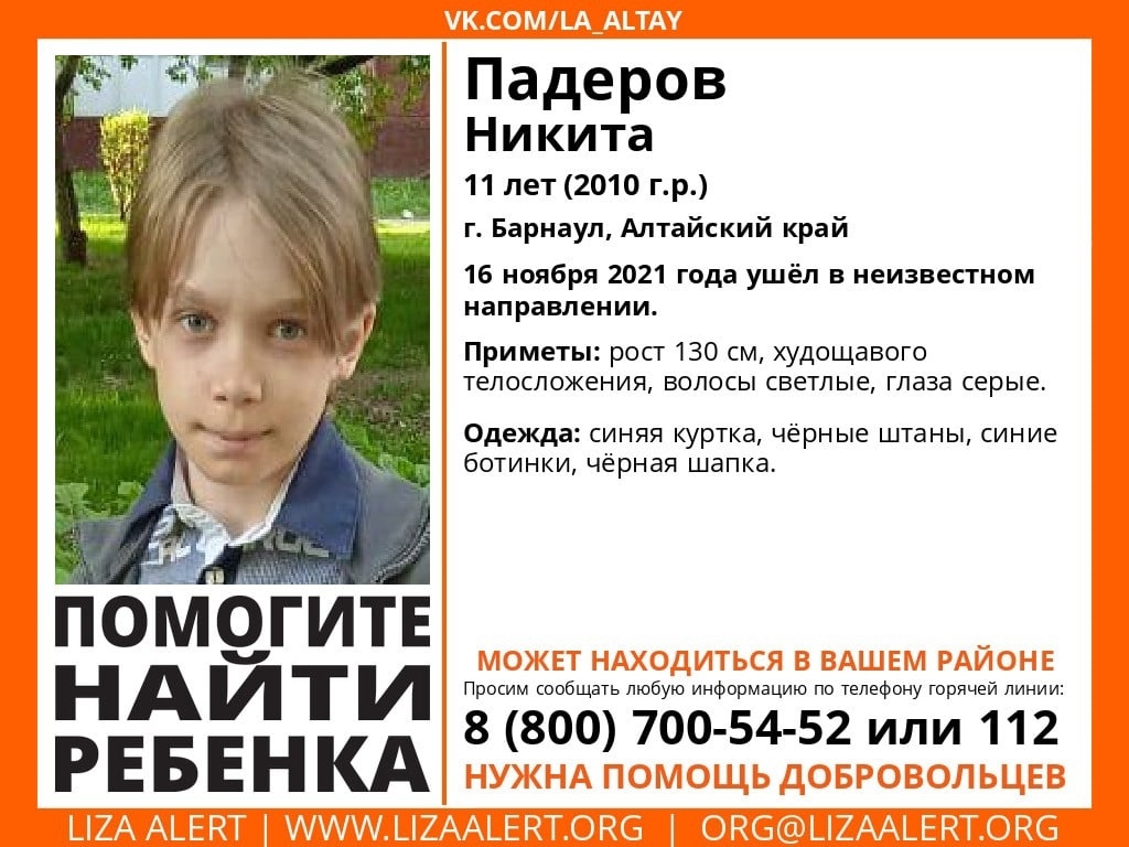 В Барнауле идут поиски 11-летнего мальчика, который в сентябре уже пропадал из дома. Как сообщает региональное отделение ПСО "Лиза Алерт" в группе во "ВКонтакте", ребёнок ушёл 16 ноября в неизвестном направлении.