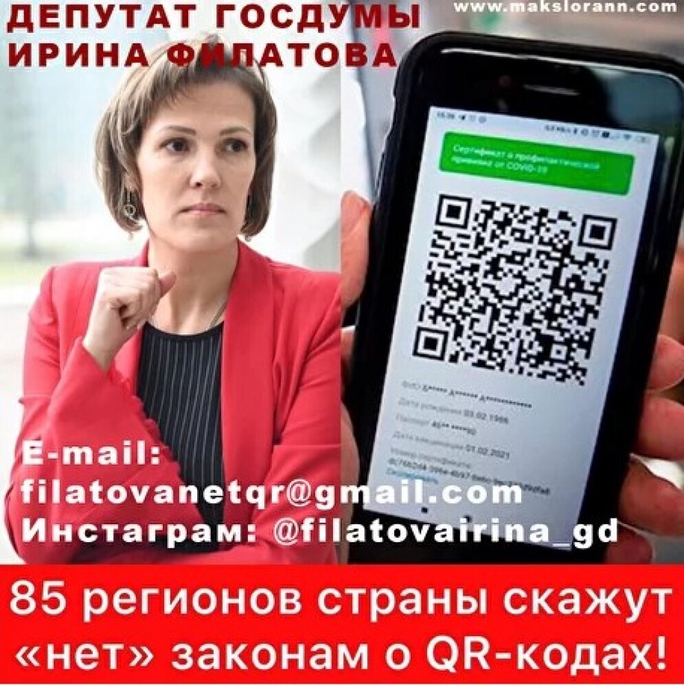 Депутат Госдумы Ирина Филатова просит в течение 3 дней направить на её личную электронную почту: filatovanetqr@gmail.com ваши обращения против законопроекта о введении QR-кодов. Обязательно указать регион, в котором вы проживаете!
