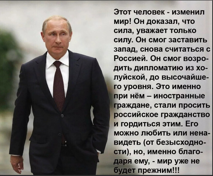 согласна только до : В.В. ПУТИН - СОЗИДАТЕЛЬ, который не только совершенствует наше ОБЩЕСТВО, но и создаёт современные предприятия, с новейшими технологиями, что в конце концов позволит России повысить благосостояние нашего Народа - Когда, когда оно повысится, вниз катится, после войны шустрей работали).