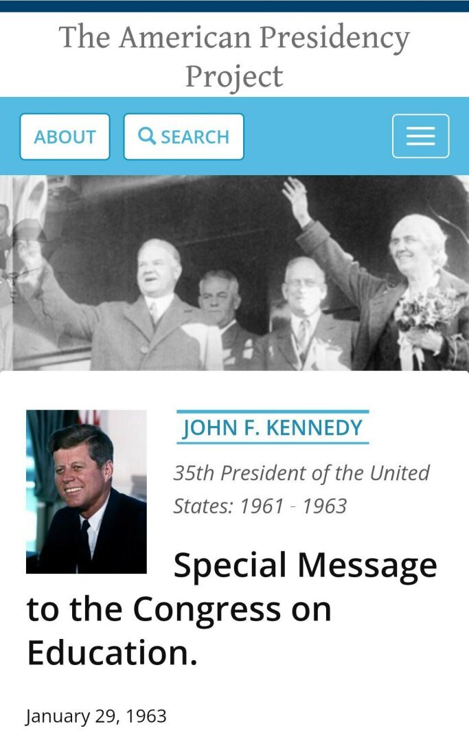 Из всего, что удалось обнаружить, внимания заслуживает следующее. Самим Джоном Кеннеди был озвучен вполне официальный документ — его "Специальное послание Конгрессу по вопросам образования" 29 января 1963 года. Собственно говоря, это была своего рода презентация реформы американской системы образования. Сопоставление США с Советским Союзом в этом плане вполне объяснимо, потому как в СССР как раз некоторые предварительные итоги можно было подводить образовательной реформе, начавшейся в середине 1950-х годов под лозунгом укрепления связи школы с жизнью. Итак, в самом конце своего обращения к Конгрессу американский президент сказал следующее: