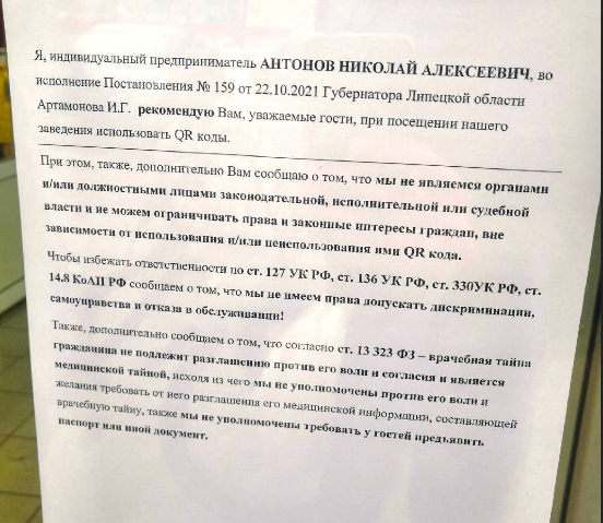 А в городе Ельце Липецкой области ИП Антонов, которому принадлежит ТЦ" Орион" вывесил при входе в ТЦ рекомендацию об использовании qr-кодов, обосновывая рекомендацию, а не требование тем, что у его сотрудников нет на то полномочий, перечислив статьи УК РФ, 127, 136, 330, ст.14.8 КоАП РФ. Что они не имеют права допускать дискриминацию, самоуправство и отказ в обслуживании.