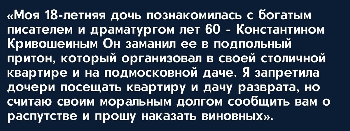 Хрущев получил проверить анонимку и вскоре в прокуратуре нашли похожее письмо от другой гражданки. Зинаида Лобзикова, инструктор по культуре одного из столичных исполкомов, слезно просила вырвать из лап того же Кривошеина ее дочь Алину., студентку балетного училища. Коварный драматург, якобы, обещал девушке место в труппе Большого театра и заманил ее на дачу, где над ней надругались его высокопоставленные друзья.