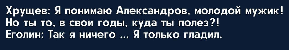 По легенде, когда компромат подтвердился, Хрущев вызвал Еголина и Александрова на ковер. Министр культуры тут же во всем покаялся и назвал посещения «дома терпимости» самой большой ошибкой в своей жизни. Чтобы разжалобить Хрущева, он даже вспомнил тяжелое детство в интернате. А вот с Еголиным у лидера государства произошел особый разговор: