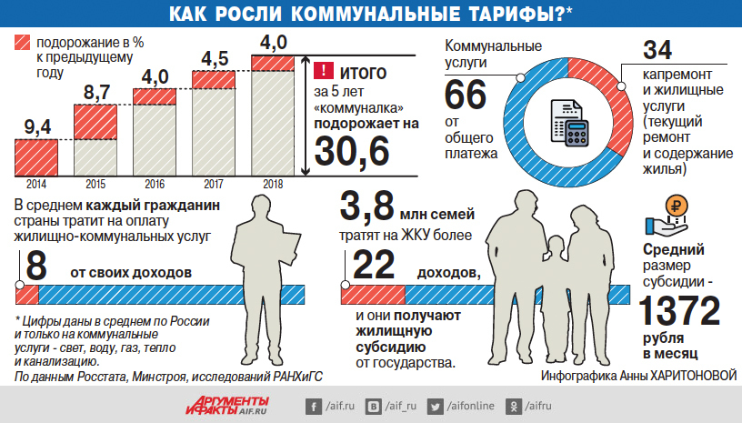 У нас в России на оплату ЖКХ уходит иногда до 40 % семейного бюджета и больше. В Австрии, Венгрии и Польше эти же расходы составляет около 10 %, в Швеции — менее 4 %. В этой связи КПРФ предлагает ввести мораторий на рост тарифов ЖКХ, оплата услуг которого должна не превышать 10 %.
